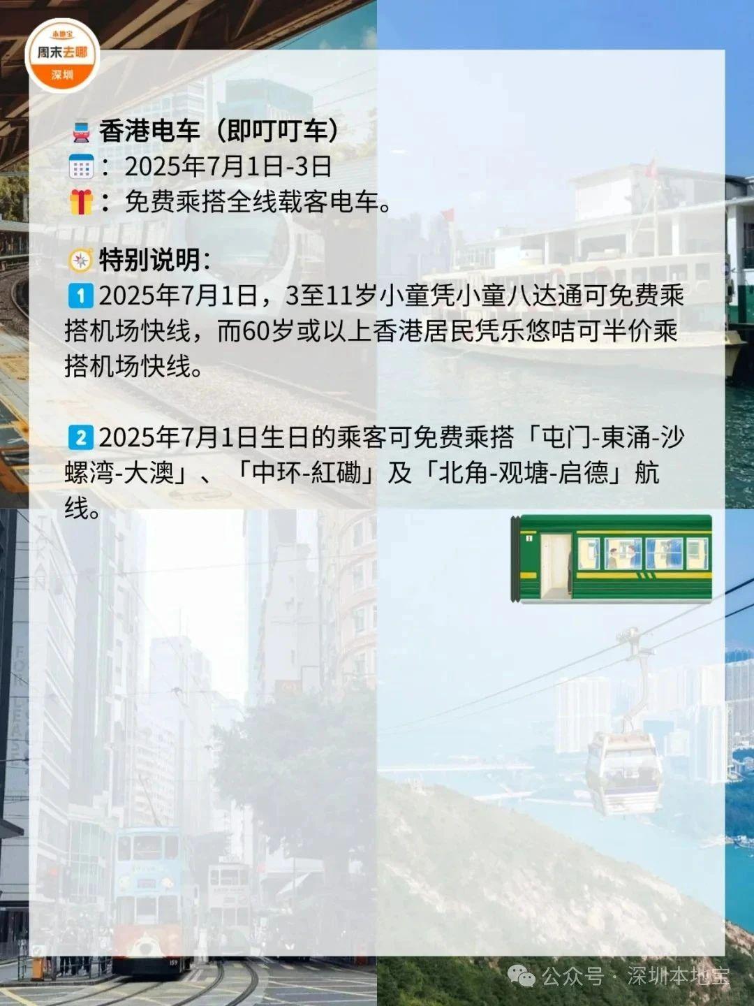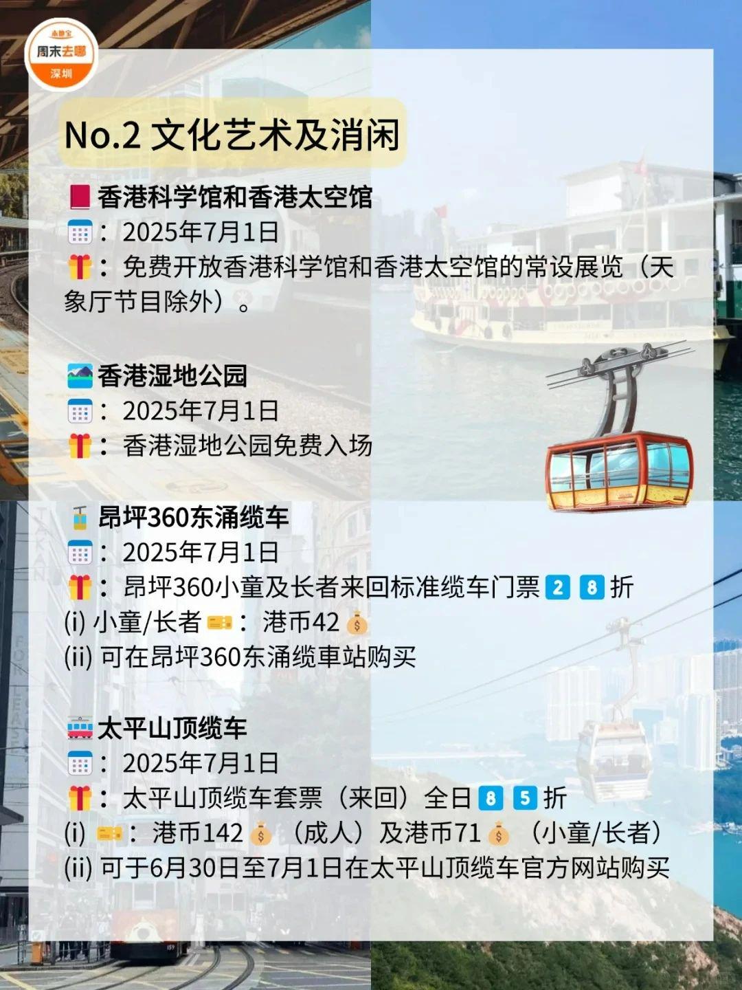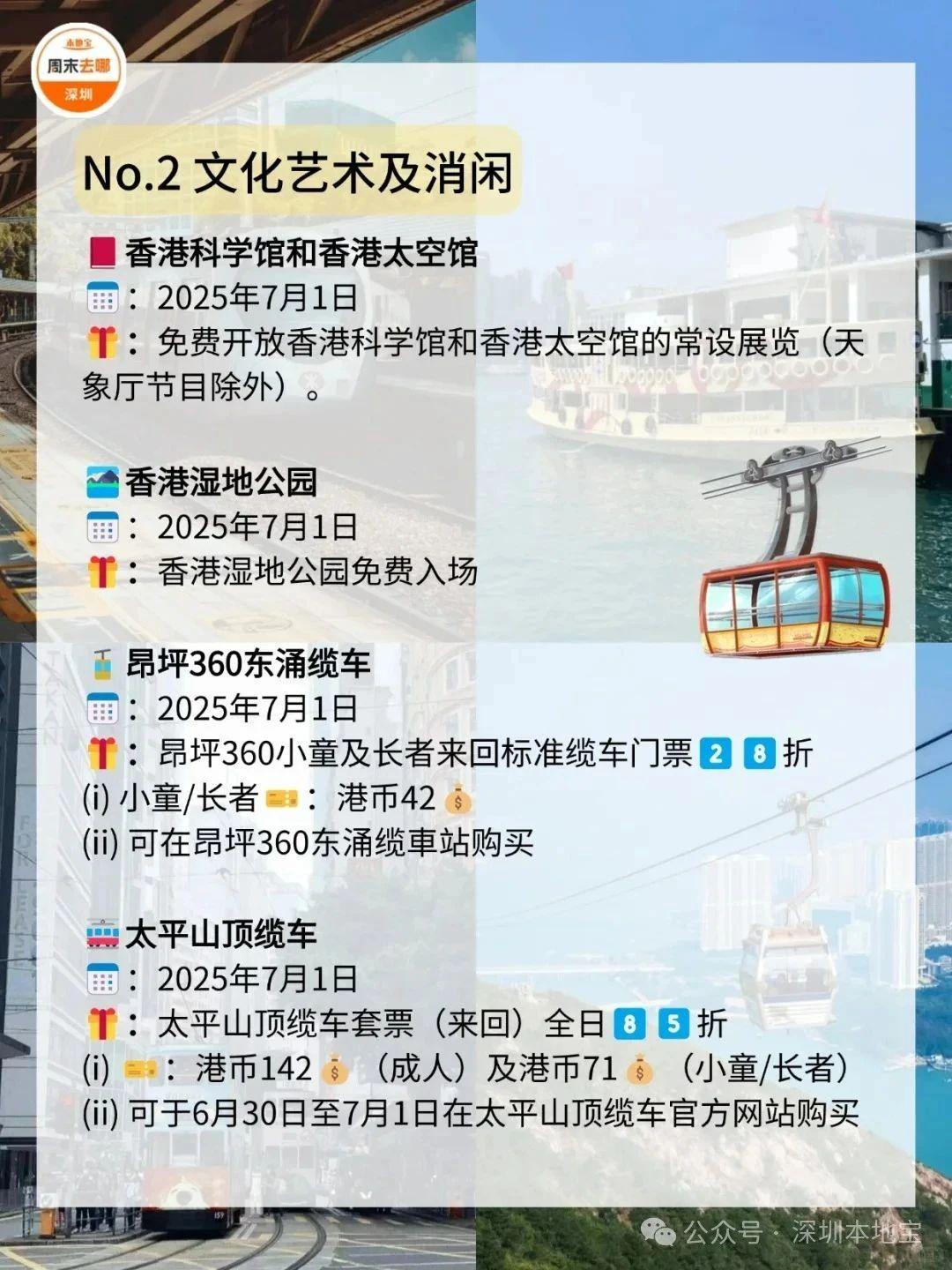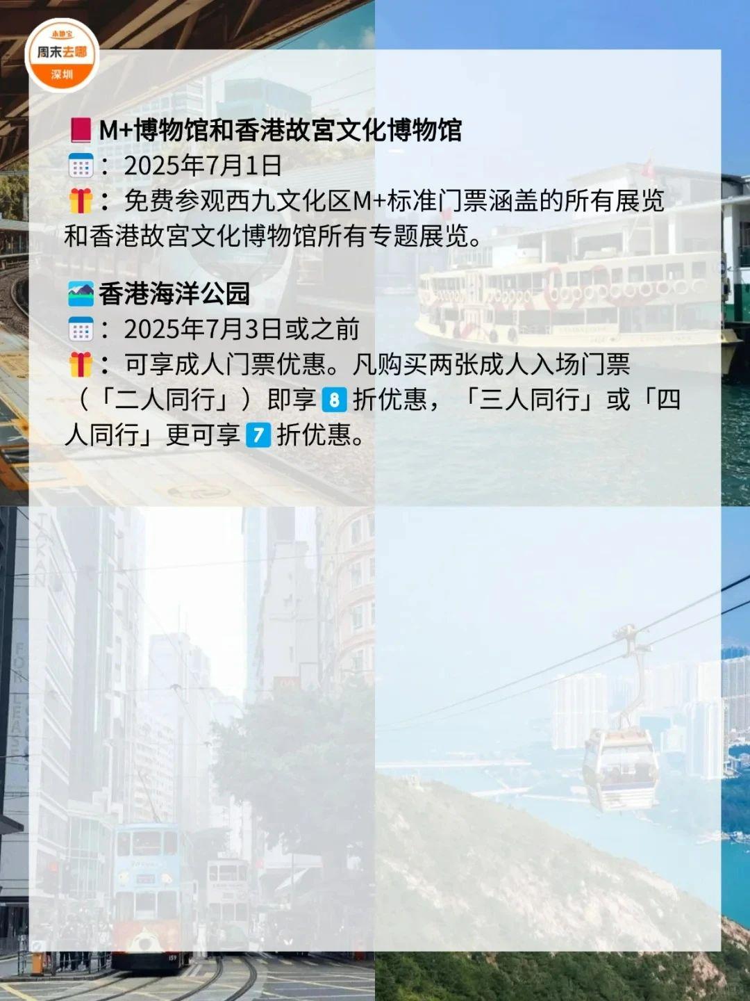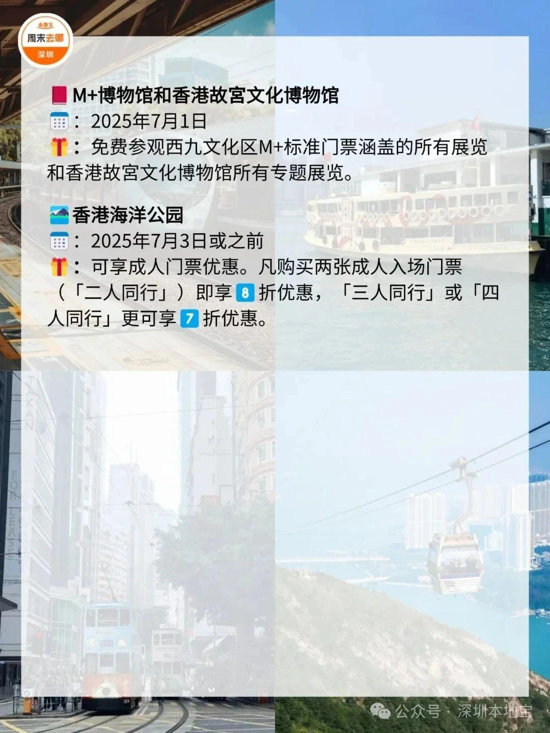 在7️⃣月1️⃣日这天,去一趟香港吧!叮叮车、天星小轮等免费坐故宫博物馆、M+博物馆、科学馆和太空馆免费逛快来收好这份游玩攻略!·公共交通☑️电车(叮叮车):7月1日至7月3日免费乘坐。☑️7.1万张电子车票免费送;7月1日乘坐机场快线,3岁至11岁儿童免费、60岁或以上市民半价。☑️7月1日免费乘搭「尖沙咀-湾仔」航线。☑️7月1日免费乘坐多条渡轮航线,其中部分渡轮航线会提前派发乘船券。·文化艺术及消闲娱乐☑️7月1日香港湿地公园免费入场。☑️7月1日免费开放香港科学馆和香港太空馆的常设展览(天象厅节目除外)。☑️7月1日免费参观西九文化区M+标准门票涵盖的所有展览和香港故宮文化博物馆所有专题展览。(*M+博物馆方会视乎当日情况天平配资,或在18:00截止排队入场,以确保访客能获得优质的参观体验;香港故宫博物馆需提前预约)☑️活化历史建筑伙伴计划的12个项目加开免费导赏团。☑️7月1日太平山顶缆车套票(来回)有活动票。☑️7月3日或之前单人、双人或三人到访香港海洋公园有活动票。☑️7月1日昂坪360东涌缆车小童及长者有活动票。·餐饮✅过千间食肆提供优惠和活动,包括机场、东日街市、香港仔街市、荔湾街市、天水围天幕街市、油塘大本型商场等,部分产品享7️⃣1️⃣折或以上活动。·更多详情立即查看上方图片了解也可以点击【@深圳本地宝】公众号,回复【香港游玩】关键词即可获取深圳去香港港铁8折优惠、香港故宫博物馆预约入口等·来源:香港商报、香港旅游发展局、香港政府一站通、廿四、摄图网ID:330999464、501061198、酷吧、图虫创意-579078921476636762、424896647890468874综合整理:深圳本地宝