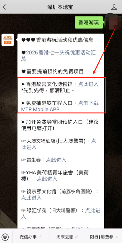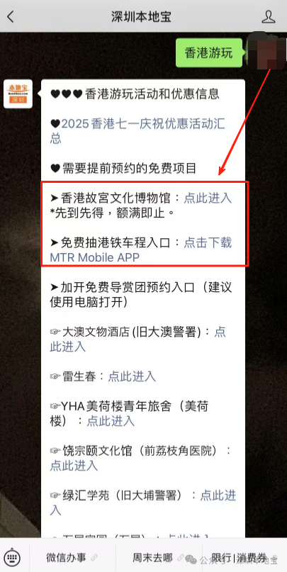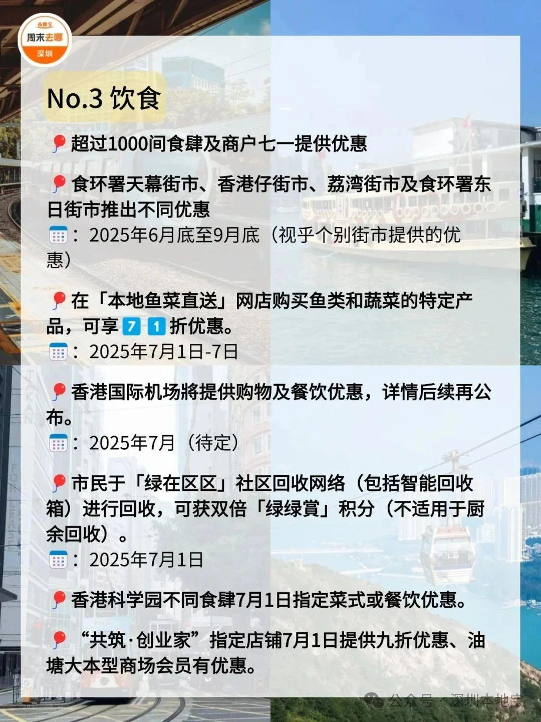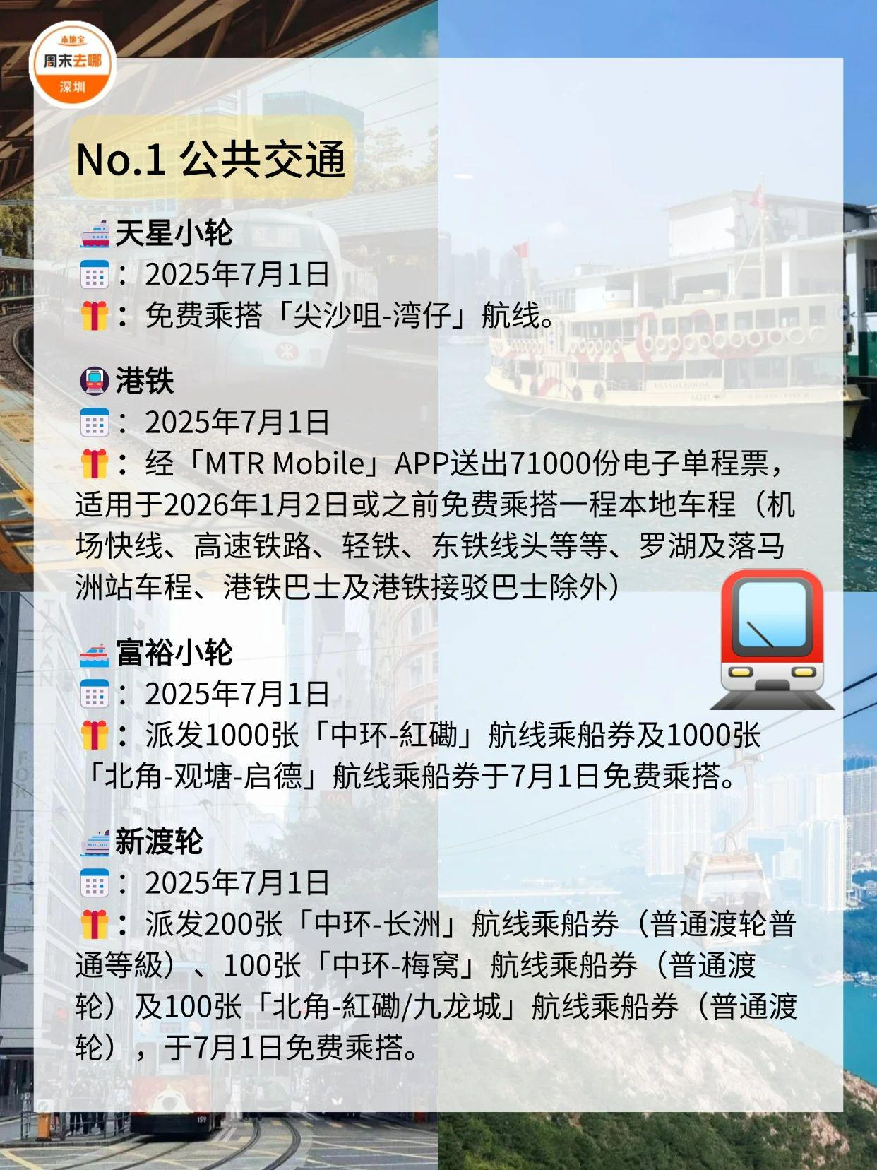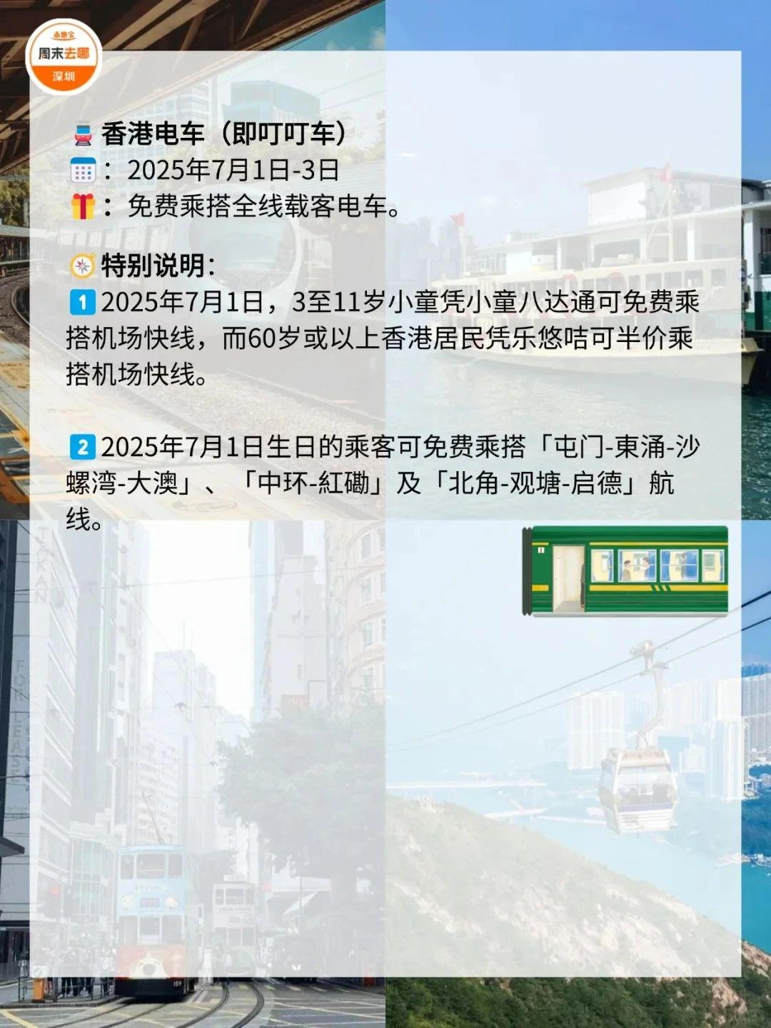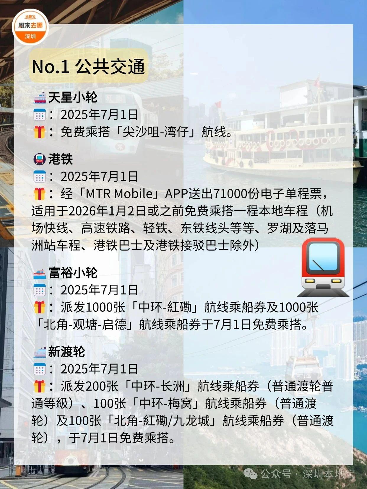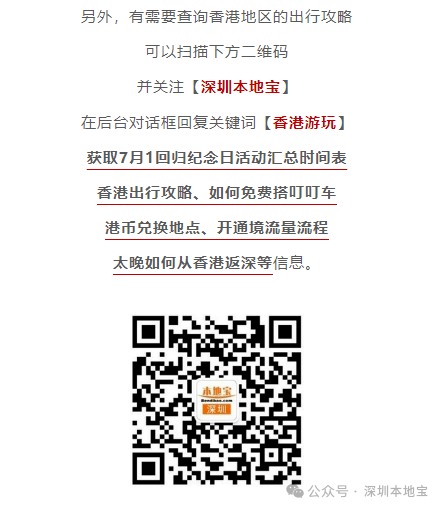 在7️⃣月1️⃣日这天,去一趟香港吧!叮叮车、天星小轮等免费坐故宫博物馆、M+博物馆、科学馆和太空馆免费逛快来收好这份游玩攻略!·公共交通☑️电车(叮叮车):7月1日至7月3日免费乘坐。☑️7.1万张电子车票免费送;7月1日乘坐机场快线,3岁至11岁儿童免费、60岁或以上市民半价。☑️7月1日免费乘搭「尖沙咀-湾仔」航线。☑️7月1日免费乘坐多条渡轮航线,其中部分渡轮航线会提前派发乘船券。·文化艺术及消闲娱乐☑️7月1日香港湿地公园免费入场。☑️7月1日免费开放香港科学馆和香港太空馆的常设展览(天象厅节目除外)。☑️7月1日免费参观西九文化区M+标准门票涵盖的所有展览和香港故宮文化博物馆所有专题展览。(*M+博物馆方会视乎当日情况天平配资,或在18:00截止排队入场,以确保访客能获得优质的参观体验;香港故宫博物馆需提前预约)☑️活化历史建筑伙伴计划的12个项目加开免费导赏团。☑️7月1日太平山顶缆车套票(来回)有活动票。☑️7月3日或之前单人、双人或三人到访香港海洋公园有活动票。☑️7月1日昂坪360东涌缆车小童及长者有活动票。·餐饮✅过千间食肆提供优惠和活动,包括机场、东日街市、香港仔街市、荔湾街市、天水围天幕街市、油塘大本型商场等,部分产品享7️⃣1️⃣折或以上活动。·更多详情立即查看上方图片了解也可以点击【@深圳本地宝】公众号,回复【香港游玩】关键词即可获取深圳去香港港铁8折优惠、香港故宫博物馆预约入口等·来源:香港商报、香港旅游发展局、香港政府一站通、廿四、摄图网ID:330999464、501061198、酷吧、图虫创意-579078921476636762、424896647890468874综合整理:深圳本地宝