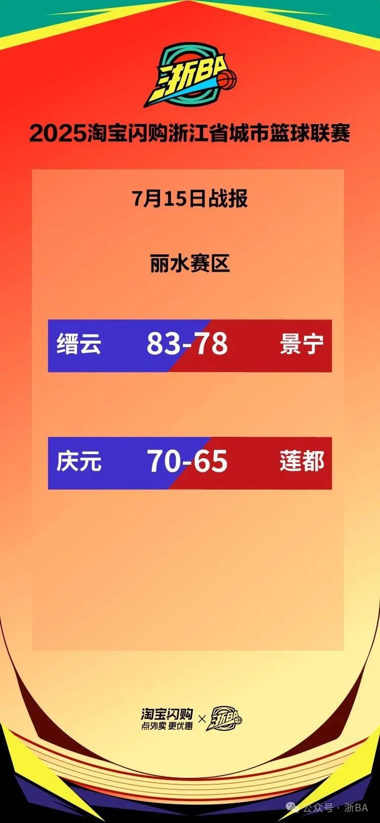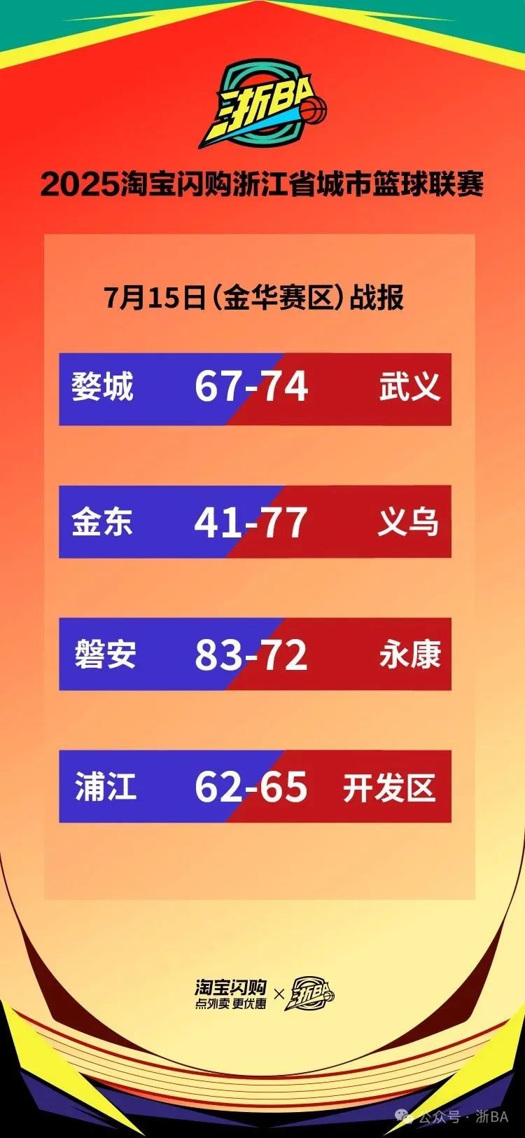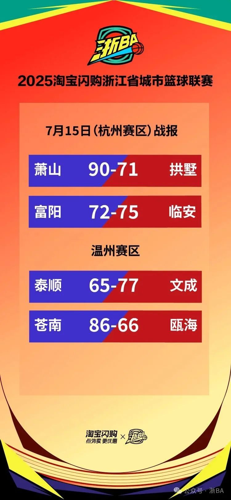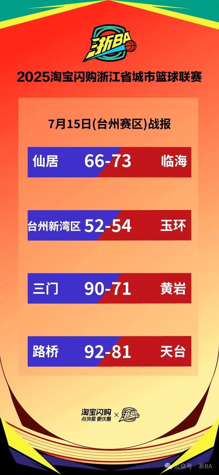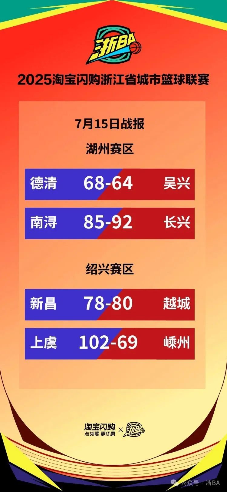 7月16日赛事安排杭州赛区(东部赛区)18:30 钱塘VS西湖20:00 临平VS拱墅杭州赛区(西部赛区)19:00 临安VS淳安宁波赛区15:00 海曙VS慈溪15:00 宁海VS奉化19:00 鄞州VS余姚19:30 象山VS江北温州赛区19:00 洞头VS龙港20:30 鹿城VS瑞安湖州赛区19:30 长兴VS安吉19:30 德清VS南浔嘉兴赛区19:30 秀洲VS经开19:30 嘉善VS南湖19:30 平湖VS桐乡19:30 海盐VS海宁金华赛区18:30 武义VS东阳18:30 永康VS兰溪19:50 义乌VS婺城19:50 开发区VS磐安台州赛区19:00 玉环VS温岭19:00 三门VS路桥20:30 椒江VS天台20:30 临海VS台州湾新区(具体比赛时间以实际举办为准)届时浙江发布视频号将进行部分赛事直播来源:浙BA