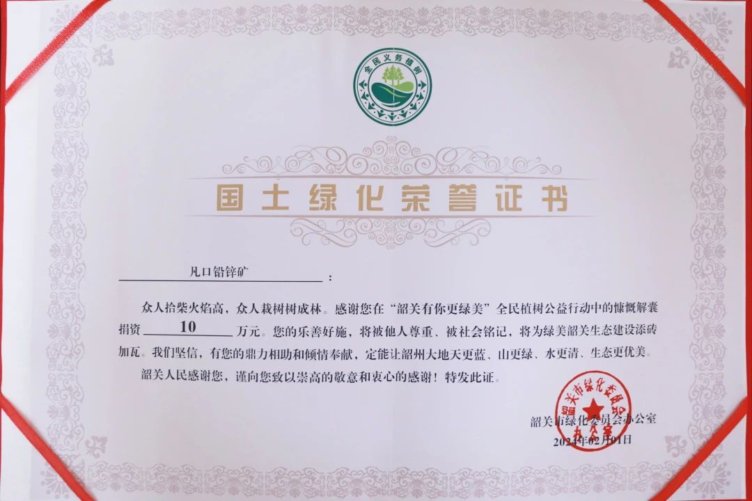 ▲2024年2月,凡口铅锌矿荣获国土绿化荣誉证书